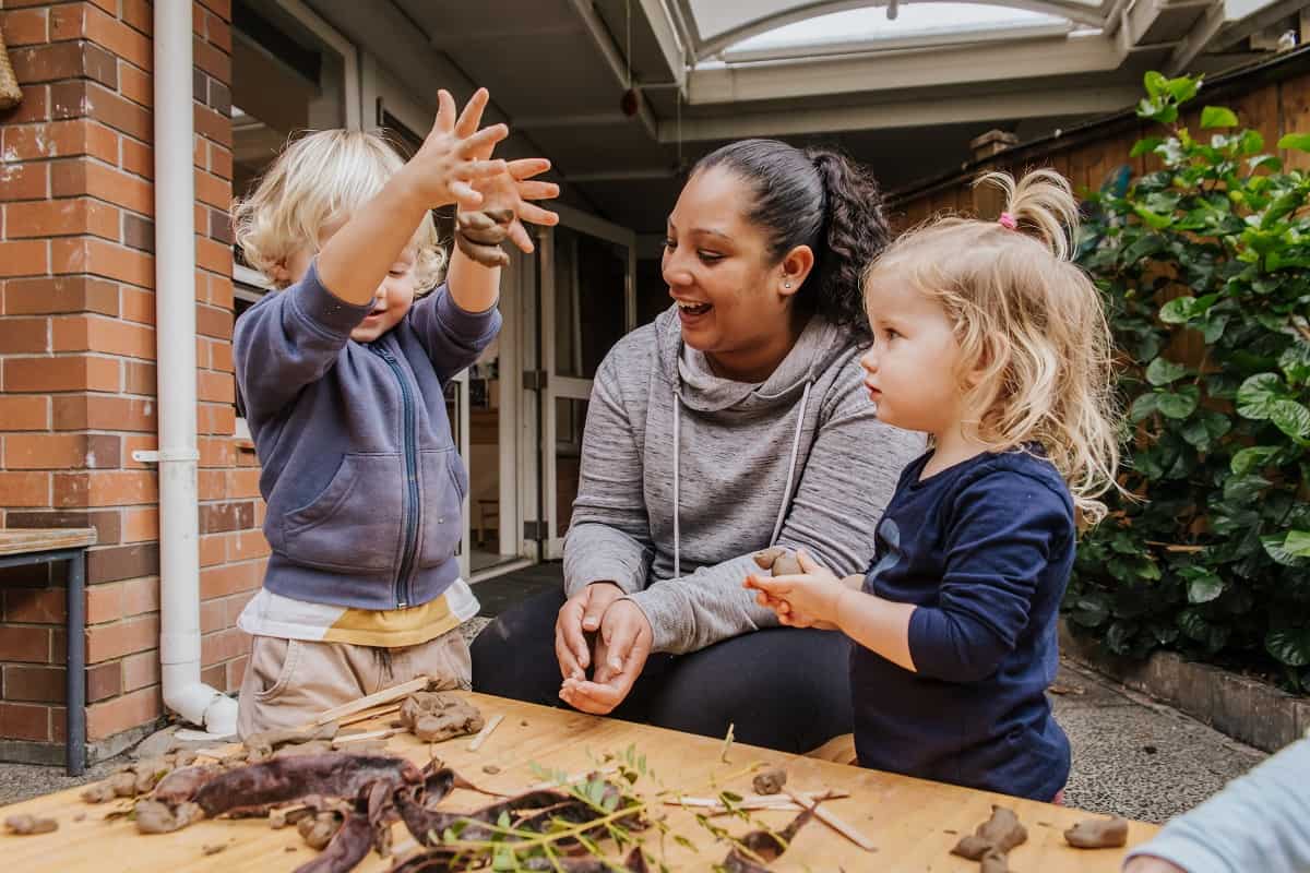 A rich language environment is one that is relevant and engaging for the child. My teaching practice is heavily influenced by Educaring® and the idea of respectful practice with others, especially the idea of working in partnership with others. I try to practise this in all my interactions with children and with my colleagues, to role model the idea of respectful engagements for children. We converse with children in every aspect of their day, inviting their participation both verbally and with actions. Conversations unfold in care moments as we sit around a table during a meal, as we change a nappy together, in the sleep room, and as we play together in the environment. We converse though speaking clearly, and pausing for a response, our gaze engaged, our body language open and inviting, and we listen to what they express, acknowledging what they have said, through their words and actions, and with our own, back and forth until the conversation’s natural ending.