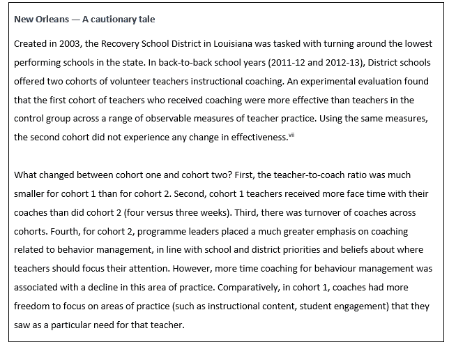 [ix] Blazar and Kraft (2020) experimentally evaluated a teacher coaching programme in New Orleans, and found large differences in effectiveness across cohorts. Exploratory analyses suggest that a likely factor for these differences was turnover of coaches across cohorts. Blazar, D., & Kraft, M. A. (2019). Balancing rigor, replication, and relevance: A case for multiple-cohort, longitudinal experiments. AERA Open, 5(3), 2332858419876252. To our knowledge, this is the only study to estimate coach effects. However, the findings are consistent with the teacher effectiveness literature, showing that personnel is the key driver of desired outcomes.