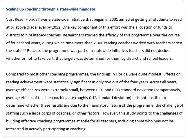 [viii] Overall, fewer studies have evaluated the efficacy of math- and science-based coaching programmes. Kraft et al. (2018) identified two studies focused on math, and three focused on science. Some of these programmes found positive effects. However, a recent experimental evaluation of a coaching programme focused on conceptually based mathematics instruction found null effects on student achievement. Kraft, M. A., & Hill, H. C. (2019). Developing Ambitious Mathematics Instruction through Web-Based Coaching: A Randomized Field Trial. EdWorkingPaper No. 19-119. Annenberg Institute for School Reform at Brown University.
