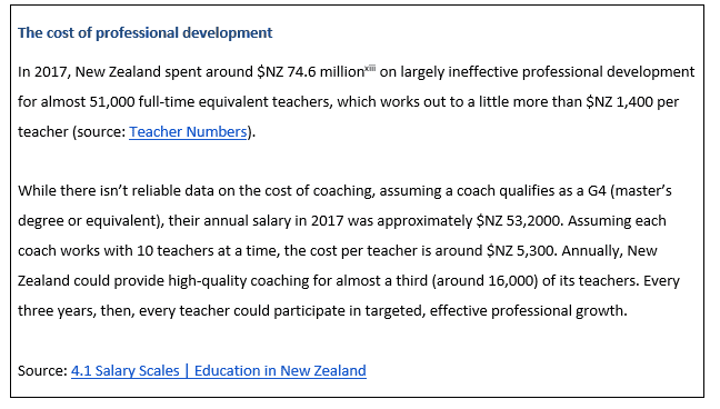 In New Zealand, leading experts and the Ministry of Education have also recognised a need to overhaul teacher professional development. Instead of allowing teachers and schools to engage in activities that are very broad in scope, development offerings are now guided by a model where engaged parties must continually assess whether professional learning activities directly align with their individual needs and those of their students.[iv] Rigorous, often experimental research shows that, not only is instructional coaching more effective than alternative forms of professional development[v], it is also one of the most effective of all educational interventions. Only high-dosage tutoring for students achieves larger effects.[vi] Notably, the logic underlying tutoring and coaching is similar: provide targeted feedback to support individuals’ needs