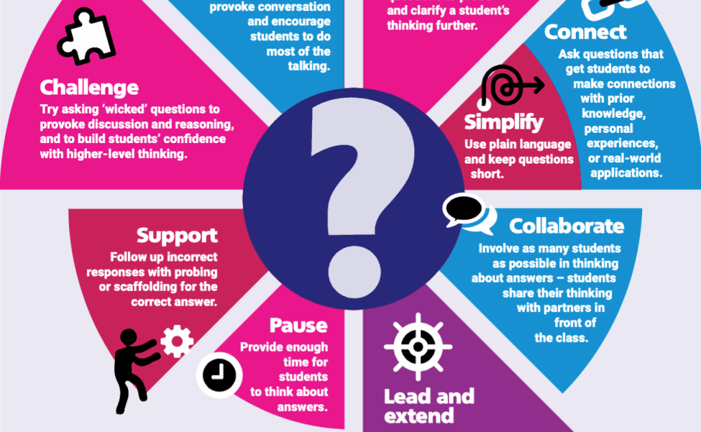 Well-crafted questions also help students to make connections between ideas, and to develop personal meaning and associations with previously learned content. When students are challenged to explain, listen and problem solve, they develop important thinking skills, strategies for working with content, and networks of ideas. Effective questioning helps students discover, evaluate and apply content, and leads to better long-term recall.